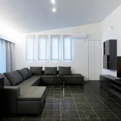 壁面は、天然石を貼り仕上げてマットな印象です。7分つや有仕上げの光沢感を抑えた塗装の仕上げは、とてもバランスがとれています。