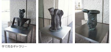 子どものアトリエ展示では、なんと、子どもがさわっていいアートがかざられています。手で見るギャラリーは、アトリエ入り口付近に「触ってもいい」彫刻作品6体(作:江田正盛)が設置されています。ぜひ行かれたかたは、子どもに「これはさわっていいんだよ」と触らせてあげてください!