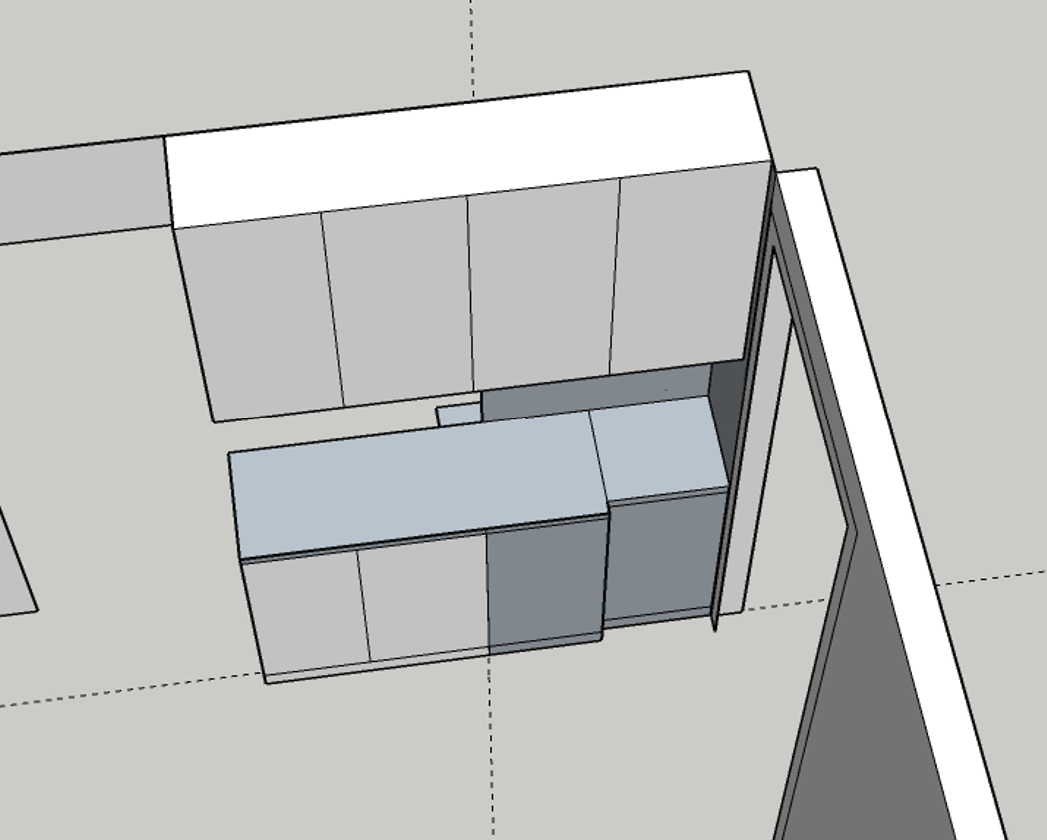 ダイニング入口部分だけ奥行を浅くする打ち合わせのときに、お客様がイメージがわかないということでしたので、3Dで立ち上げてみました。味気ない図ですが、なんとなくどのような形になるかイメージしていただけたのではないかと思います。