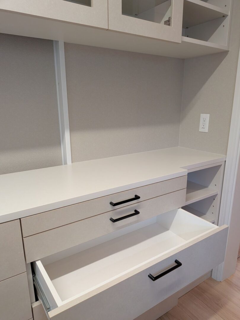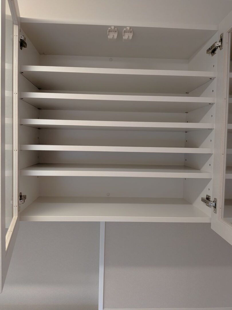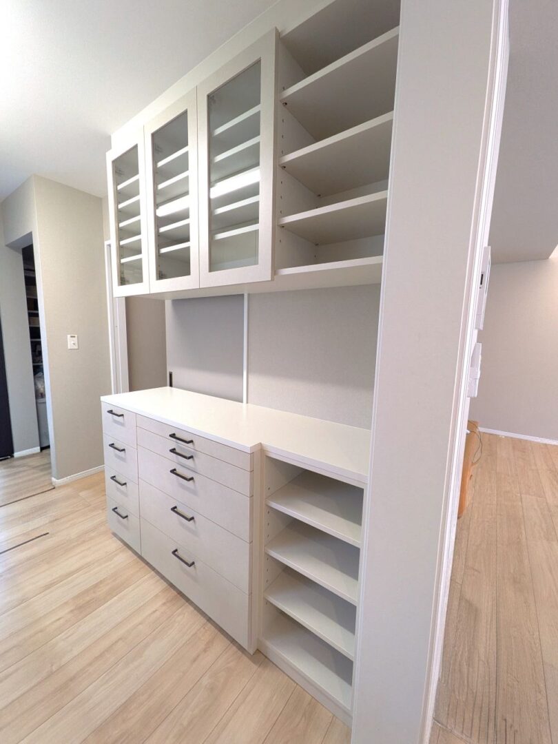 今回は、食器棚を納品しました。こちらの戸建ては、食器棚はお手持ちの家具を置かれていました。今回使いやすく、そしてすっきり見えるように食器棚をつくりました。