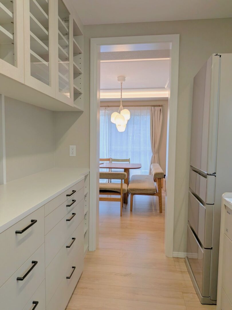 食器棚は、よく見ていただくと、白色ではありません。もともと壁紙もグレージュでしたので、白ではなく、ほんのりベージュ色をえらんでいます。天板はキッチンに合わせて白なので、扉や棚の収納部分に色がついているのが分かるかと思います。ダイニング側の収納は扉をつけずに、お子様たちもすぐにパンや必要なものが取れるようにしています。