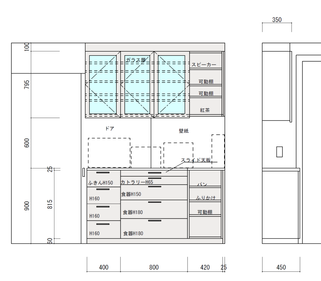下の図は、最終の打ち合わせ図面です。お客様との打ち合わせの内容を、このように図面にして確認していただきます。図の点線で描いている部分は、家電が置かれるので、配膳のときにはスライド天板や活躍します。写真では分かりませんが、吊戸棚の下にはメラミン化粧板を貼っているので、家電の蒸気などで汚れたときも、掃除がしやすいようにしています。配線関係も配線穴をつくり、隠したり、すっきり見せることができるのが、オーダー家具の良いところです。